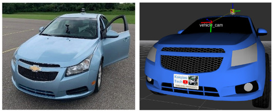 For development and testing, we employ a real-world sensing platform consisting of a Chevrolet (Detroit, MI, USA) Cruise vehicle equipped with an Ouster OS1-64 LiDAR (Ouster, Inc., San Francisco, CA, USA) mounted on the roof and a Logitech RGB camera (Logitech, Lausanne, Switzerland) positioned on the windshield (see Figure 1). To facilitate algorithm evaluation and simulation under controlled conditions, a simulation of the vehicle was constructed in the Robot Operating System (ROS) environment (ROS Noetic, Ubuntu 20.04). This virtual model preserves the real vehicle’s geometry and sensor placement, enabling reliable reproduction of sensor data streams and frame transformations.
