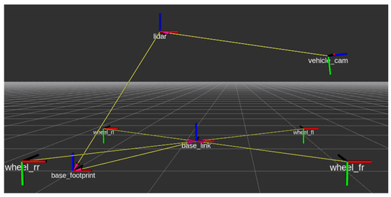 As illustrated in Figure 2, the transform (TF) tree of the vehicle model defines the spatial relationships between the vehicle body and its mounted sensors using six degrees of freedom—roll, pitch, yaw, and x, y, z translations. The base_footprint frame represents the vehicle’s reference point on the ground, typically defined at the geometric center between the rear wheels. The vehicle_cam frame, corresponding to the camera’s physical location, is defined as a child frame relative to the LiDAR frame.