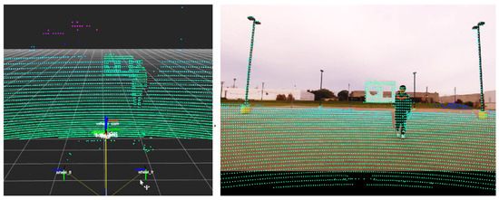 As illustrated in Figure 3, a checkerboard calibration target with two cut-out holes was used to evaluate the alignment between LiDAR and camera data. Within the ROS RViz environment, both the LiDAR point cloud and the vehicle’s TF tree are visualized, demonstrating the spatial consistency between the 3D LiDAR data and the 2D image plane. The resulting point cloud captures distinct environmental features such as the ground surface, vertical light poles, and the calibration board itself, verifying the accuracy of the fusion setup.