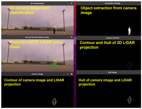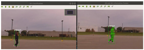 where is the camera intrinsic matrix. This projected mapping enables spatial comparison between LiDAR and camera features, which is essential for the proposed SVD-based pattern matching algorithm. We employed the YOLOv5s architecture for object detection, consisting of CSPDarknet53 backbone, PANet neck, and YOLO head layers. The model was pretrained on the COCO dataset (80 object categories, 118 k images) and fine-tuned on a custom dataset of 3000 manually labeled pedestrian images captured under urban driving conditions. The input resolution was 640 × 480 pixels, using a stochastic gradient descent optimizer with a learning rate of 0.01 and batch size of 16. The confidence threshold for detection was set to 0.4 during inference. As shown in Figure 4, the CNN detection result from the camera is overlaid with the projected LiDAR point cloud on the 2D image.