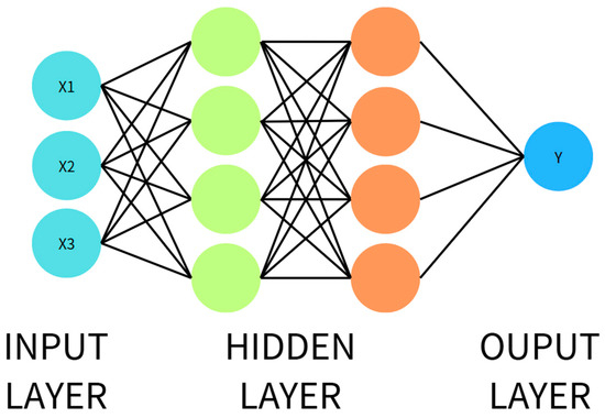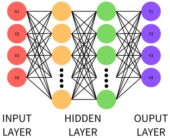 An ANN simulates the connection mechanism of biological neurons and is composed of input, hidden, and output layers. Each neuron transmits input information to the next layer through weights and applies a non-linear transformation via an activation function. An ANN is suitable for structured data and can learn the mapping between input features and output classes. However, its performance is limited for complex data, requiring deeper architectures (e.g., DNN) for enhancement. The ANN schematic is shown in Figure 1, and its operation is described in Equation (7).