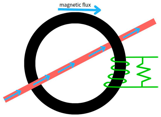 To conduct tool breakage monitoring experiments, we designed a non-contact monitoring system based on spindle current. The current signal is primarily captured using an SCT013 current sensor, as shown in the wiring diagram in Figure 4. This sensor is a type of split-core current transformer (CT) that operates based on the principle of electromagnetic induction, illustrated in Figure 5. It can be directly clamped onto the motor power cable without interrupting machine operation or requiring any hardware or wiring modifications, thereby enabling non-intrusive measurement. The sensor outputs a voltage signal proportional to the current, which is then divided and filtered before being sent to a data acquisition device for storage and analysis.