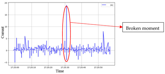 During each simulated breakage event, the operator simultaneously pressed a timestamp button, marking the corresponding signal as the Ground Truth for training and evaluation. All breakage simulations were performed by the same operator under identical cutting conditions, using standardized triggering actions (e.g., consistent tapping angle and force) to ensure experimental consistency and reproducibility. Figure 7 shows the time domain variation in the current signal from one of the experiments. A significant disturbance can be observed at approximately 17:20:31, corresponding to the tool breakage event recorded by the operator. Some smaller current fluctuations are also present, caused by external factors such as relay switching. However, these background fluctuations did not produce prominent high-frequency energy spikes in the subsequent frequency domain analysis and were therefore not misclassified as breakage events. The system relies primarily on the presence of sharp high-frequency spikes as the key distinguishing feature, allowing it to effectively differentiate tool breakage signals from normal background variations and thereby enhancing classification robustness.