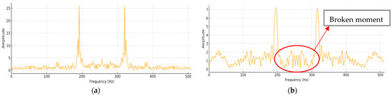 Figure 8 presents the frequency domain spectra (FFT results) obtained from this experiment. Subfigure (a) shows the spectrum under normal machining conditions, while subfigure (b) depicts the spectrum at the moment of tool breakage. A comparison between the two reveals significant spectral changes, particularly the emergence of sharp high-frequency energy spikes during breakage. These spike features were consistently observed in more than 18 out of 20 experiments, confirming their high reliability as indicators of tool breakage. However, it is essential to eliminate background disturbances—such as those caused by motor startups and relay switching—prior to frequency domain analysis to ensure accurate feature extraction.