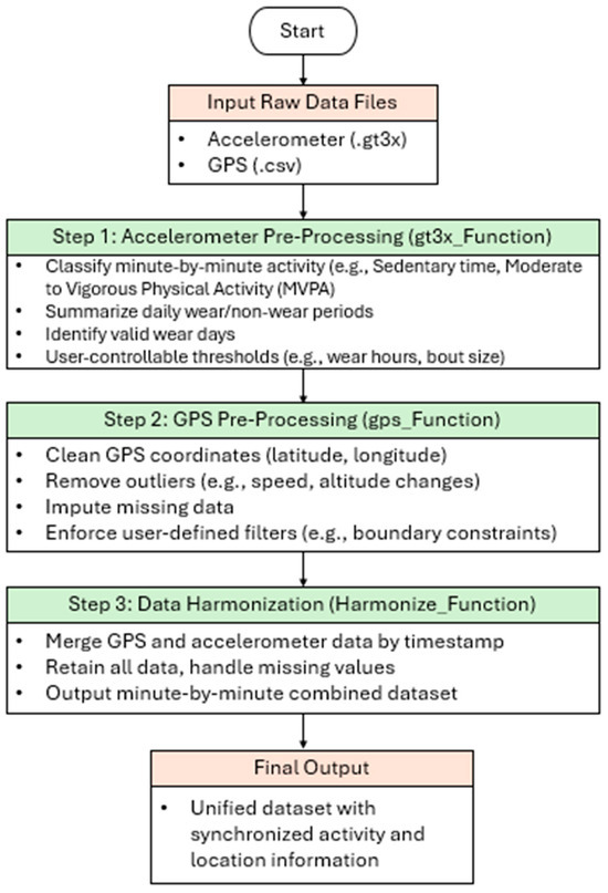 AGPSR is a three-part R pipeline that (1) pre-processes and cleans accelerometer gt3x files, (2) pre-processes and cleans GPS logger comma-separated value (csv) files, and (3) harmonizes accelerometer and GPS logger files. Each of the three parts of AGPSR is coded as a separate R function, with clearly defined input file types and user-controllable parameters. AGPSR functions are provided on a freely available github page [20] along with additional documentation and example files. Detailed input values, methodological approaches, and outputs are also available in the supplemental materials. The following subsections provide a high-level overview of each of the three steps that make up AGPSR, while Figure 1 provides an overview of the workflow.