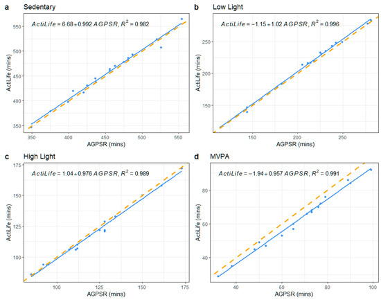 Scatterplots of Actilife results vs. AGPSR (participant B). Minutes of sedentary (a), low-light (b), high-light (c), and moderate-to-vigorous (MVPA) (d) activity are plotted based on the AGPSR pipeline vs. the ActiLife pipeline across a 21-day period for a single participant. The orange line is the line y = x, while the blue-dashed line is the best fit regression line. The association between the methods is high, as evidenced by the high R2 (over 0.98 in all cases). Furthermore, bias in the output from AGPSR is low (y-intercepts of the best fit line are close to zero, and slope coefficients are close to one) in all four cases.