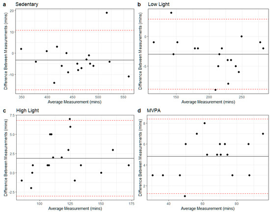 Bland–Altman plots of ActiLife vs. AGSPR (participant B). The plots highlight sedentary (a), low-light (b), high-light (c), and moderate-to-vigorous (MVPA) (d) activity for the AGPSR pipeline vs. the ActiLife pipeline across a 21-day period for a single participant. The average value of the two methods (AGPSR and ActiLife) on each day (x-axis) are plotted against the difference in the two measurements (y-axis), with lines representing the average difference (black) and mean ± 2 SD (red-dashed). With a loan exception (sedentary time on one day), the values show little to no outliers or drift.