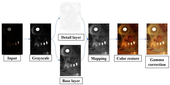 The detail layer is obtained by calculating the difference between the logarithmic domains of the original grayscale image and the bilateral filter output. After combining the base and detail layers, an exponential transformation generates the tone-mapped grayscale image. Finally, the RGB values are restored from the tone-mapped grayscale image, and gamma correction is applied to produce the final output.