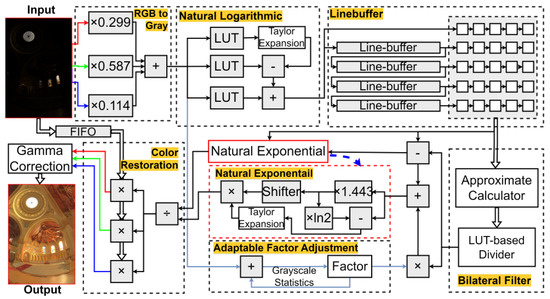 Figure 3, consists of a bilateral filter module, natural logarithm, and exponential modules, as well as several dividers and multipliers. The entire design was conceived with hardware implementation constraints as a primary consideration, where algorithmic choices were carefully tailored to enable efficient hardware realization. To balance computational precision and resource efficiency, the system primarily employs fixed-point pipelining arithmetic, retaining floating-point computation only for tasks with high-precision requirements, such as logarithmic and exponential functions. Notably, the bilateral filter module employs fixed-point arithmetic not only for its hardware-friendly properties but also because its computational structure was specifically optimized to maintain filtering quality while minimizing resource overhead. Similarly, the precision requirements for transcendental functions were determined through iterative analysis of both algorithmic needs and hardware implementation trade-offs.
