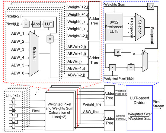 The divider is usually the critical path with high latency. In the architecture, an LUT-based divider is adopted, which converts the division of a 16-bit dividend and an 8-bit divisor into two multiplications, using 8-bit and 18-bit multipliers, respectively. For the weight sum, eight LUTs and an 8-input LUT are used to convert it to its reciprocal. Since the multiplier’s delay is less than that of the divider, the divisor is converted to its reciprocal, and division is replaced by multiplication. For these eight LUTs, each store 32 reciprocals, selected by the last five bits of the weight sum, and these eight LUTs correspond to the highest three bits of the weight sum. The lookup process is divided into two steps to improve path speed. The stored reciprocals are 18-bit numbers, determined by the maximum weighted pixel. After conversion, it is extended to two multipliers, with 18-bit and 8-bit inputs, respectively, to reduce latency.