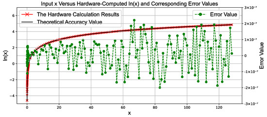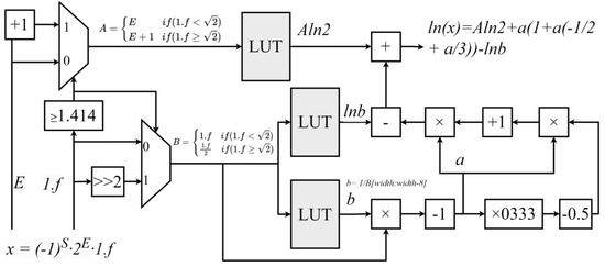 As described in (24), the design of the logarithm function module combines a lookup table with polynomial approximation. First, the input value is preprocessed to obtain A and B. Then, a single Halley iteration is performed on B to compute b. The values of and are precomputed and stored in the lookup table. Subsequently, b is used to calculate a, and the natural logarithm value is finally obtained using a Taylor expansion.
