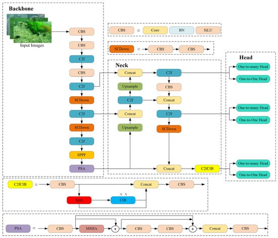As shown in Figure 2, the structure of YOLOv10n is divided into three parts: backbone, neck, and head. The backbone extracts multi-scale features from the input image and mainly consists of CBS modules, SCDown modules, C2f modules, the fast spatial pyramid pooling (SPPF) modules, and partial self-attention (PSA). Each CBS block is composed of a convolution (Conv) layer, a batch normalization layer (BN), and a SiLU activation function. The SCDown module is made up of two convolution (Conv) layers, where the first convolution adjusts the number of channels and the other is used for downsampling. The C2f module consists of two convolution layers and some bottlenecks. The SPPF module performs max pooling on the input feature maps using pooling kernels of sizes 5 × 5, 9 × 9, and 13 × 13. It then aggregates the pooled feature maps via a concatenation layer, which captures multi-scale features. The PSA module consists of four convolution layers and multi-head self-attention (MHSA). The neck fuses and enhances the multi-scale features extracted by the backbone. It leverages the Feature Pyramid Network (FPN) and Path Aggregation Network (PAN) to integrate semantic and spatial information from multiple feature maps, thereby improving detection performance for various targets. The fused feature maps are subsequently provided to the detection head. The primary function of the head is to predict object localization and classification.