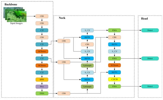 This paper introduces a lightweight underwater object detection model BSE-YOLO, which integrates the improved Bidirectional Feature Pyramid Network (BiFPN) [], a modified C2f structure named Synergistic C2f (S_C2f), where the proposed Multi-Scale Attention Synergy Module (MASM) is applied, and the Efficient Multi-Scale Attention (EMA) module []. The proposed BSE-YOLO mainly aims to improve the perceptibility of difficult samples and small, blurred, and clustered objects to enhance the model’s detection accuracy and multi-scale robustness. Secondly, BSE-YOLO tries to reduce or not change the parameters and computational complexity to achieve a balance between accuracy and light weight. The main contributions of this paper are summarized as follows: