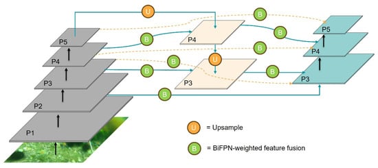 The structure of the optimized Feature Pyramid Network. “U” = upsample, “B” = BiFPN-weighted feature fusion.