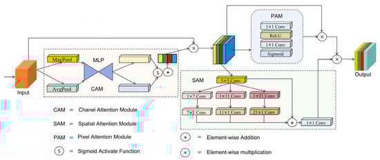 Then, the generated channel attention map is element-wise multiplied with the input feature map to generate the weighted feature map. The result is input to both the pixel and spatial attention modules. In the pixel attention module, a pixel attention map is generated through two 1 × 1 convolutional layers and ReLU and Sigmoid activation functions. The original input is then multiplied by the pixel attention map to highlight important pixel regions, resulting in the weighted pixel attention map. This process is described in Formulas (5)–(6), where denotes the feature map obtained by element-wise multiplication between the input feature map and the channel attention map ; represents the final pixel attention map.