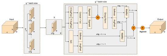 The structure of EMA. “g” = divided groups; “X AvgPool” = 1D horizontal global pooling; “Y AvgPool” = 1D vertical global pooling.