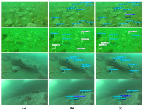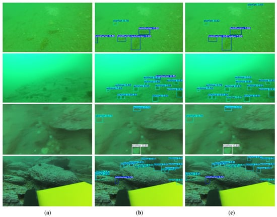 Detection results on URPC2020. (a) Raw image; (b) YOLOv10n; (c) BSE-YOLO.