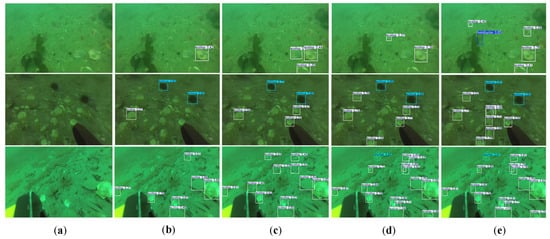 To further demonstrate the practical detection performance of both models, we visualized the inference results under different input resolutions. As shown in Figure 11, both YOLOv10n and BSE-YOLO were capable of detecting underwater targets effectively on the Orange Pi 5B. Specifically, (b) and (d) present the detection results of YOLOv10n with input sizes of 256 × 256 and 640 × 640, respectively, while (c) and (e) display the results of BSE-YOLO under the same conditions. It was observed that BSE-YOLO achieved comparable detection accuracy with clearer target localization while maintaining acceptable inference latency on the embedded system.
