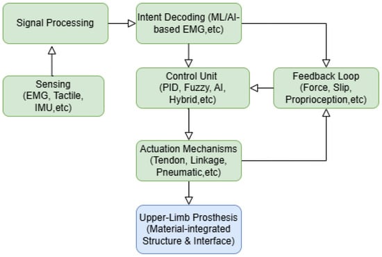 Overall schematic of key functional modules in upper-limb prosthetic systems, illustrating the flow from sensing and signal processing to control, materials integration, and final actuation.