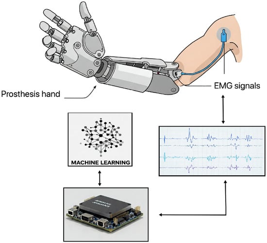 The integration of EMG signals into human–machine interfaces (HMIs) has greatly improved prostheses, helping people with limb loss regain function and independence. These interfaces use the electrical signals produced by muscle contractions (see Figure 2) as a reliable control input for artificial limbs and other assistive devices. Innovations in ML and deep learning (DL) algorithms enable an exact detection of human movement patterns as prosthesis design gets ever more sophisticated, hence improving both usability and functionality.