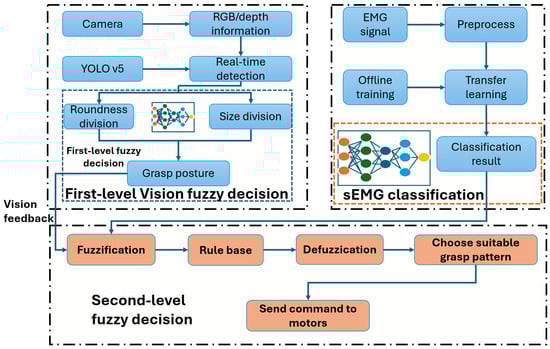 A fuzzy logic control (FLC) is used to propose a new prosthetic control methodology for people with transhumeral amputation in []. The proposed framework consists of the prosthetic system, the classifier based on EMG sensors, a decision-making system based on grasp posture, and control scheme based on FLC of type-2. The proposed system was designed to resolve issues with the movement function of a lost elbow and the wrist’s part. The control system comprises a vision-based first-level fuzzy decision strategy, sEMG classification, and a second-level fuzzy decision strategy. The first-level system uses images from a camera on the prosthetic socket, processed by YOLOv5 to classify objects by roundness and size into fuzzy sets. These classifications serve as inputs to the first-level fuzzy system. Simultaneously, real-time sEMG signals are mapped to fuzzy sets and fed into the second-level fuzzy system, which then generates motor commands. Vision aids in low-light and occlusion scenarios, while sEMG compensates for fatigue and distraction. Fuzzy logic replaces fixed PID control, enabling dynamic adaptation to user and environmental changes. A framework of the proposed architecture is shown in Figure 3.