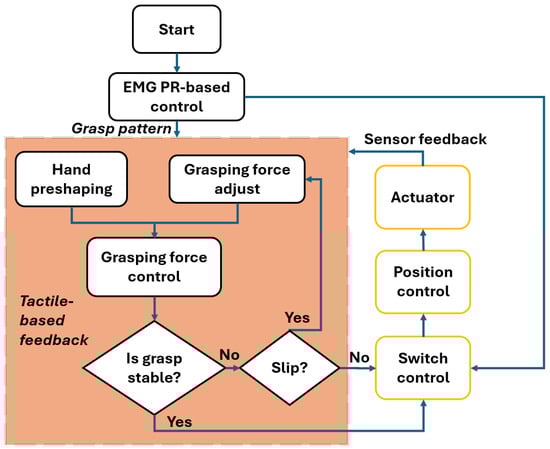 A cross-modal-based integration control algorithm was proposed in [] for a prosthetic system for human with humal amputation. To implement the proposed control system, sensor data from the EMG sensor, IMU sensor, and tactile sensor were used. The NN was utilized to train model offline and the pattern recognition was performed online based on the trained model. As a result, the intended instructions were sent to motors based on the obtained motion state. EMG-based PR control approach was introduced in [] to correctly classify patterns of a grasp action. In this work, the PR control unit receives the data from the EMG sensors and generates the corresponding pattern for a grasp action. The hand preshaping block results in the reference commands for the position and velocity, which are used as inputs for force controllers in the next stage. Thanks to the tactile sensors, the grasping controller regulates the force needed to grasp in real time. In the next step, the slip during the grasping of the object is checked by the grasping force controller. Based on the existence of the slip, more force value is applied in order to resolve a slippage. Finally, the control switch block reenables the PR algorithm when the object is released from the prosthetic hand (Figure 4).