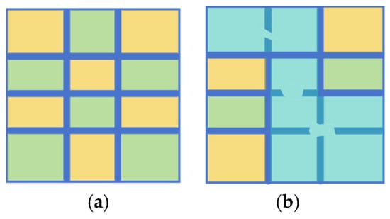 Connected Component Analysis of Table Borders. Different colors of adjacent blocks denote the absence of connectivity between regions, while the same color denotes the presence of connectivity. (a) Complete borders. (b) Borders with topological defects.
