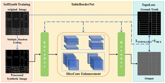 Utilizing the strong structural priors present in bordered tables from road engineering drawings, this study reformulates the table structure extraction task as a topological semantic segmentation problem, focusing on robust border delineation under challenging conditions. The overall framework, illustrated in Figure 3, is composed of three key components: SelfSynth Training, SliceConv Enhancement, and TopoLoss, which together address the typical degradation patterns and structural requirements of engineering tables. As shown in the left part of Figure 3, the SelfSynth Training module applies a Multiple-Random-Erasing strategy to the original table images, simulating common table border defects such as partial erasure, blur, and discontinuities, thereby enhancing the model’s robustness to real-world degradations and enabling it to better handle imperfect inputs. The middle section illustrates SliceConv, a structure-guided module that extracts row- and column-wise contextual feature aggregation to capture explicit structural patterns of bordered tables, thereby enabling more accurate and complete border segmentation guided by the structural prior of bordered tables. Finally, the right part incorporates TopoLoss, a topology-aware loss function that penalizes structural discontinuities during training, encouraging the model to preserve the global table layout even in degraded inputs and ensuring topological consistency.