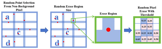 - Random Pixel Erase: for each region to be erased, we generate a random number for each non-background pixel within the region. By setting a threshold of 0.2, pixels with random numbers greater than the threshold are erased with Gaussian smoothing.
