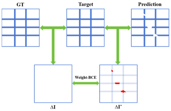The binary cross-entropy loss () serves as the foundational loss component, measuring the pixel-level difference between the network’s predictions and the ground truth labels, as shown in Equation (3), where is the number of samples, is the predicted value for the i-th sample, and is the corresponding ground truth label for the i-th sample.