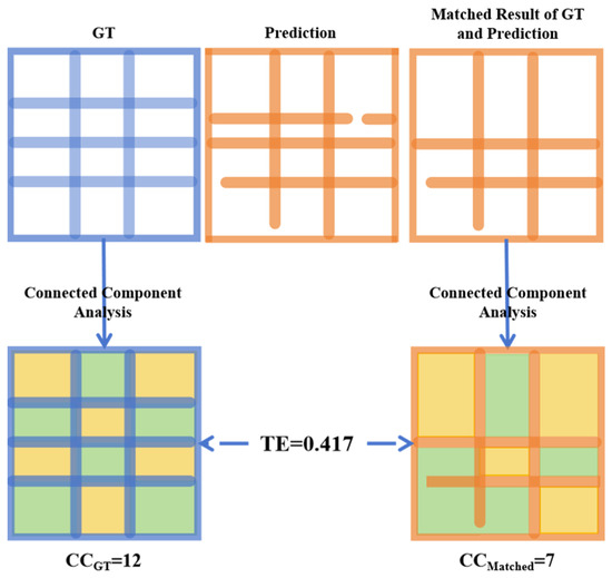 To address this limitation, we introduce the Topology Error (TE) metric, which quantifies the connectivity errors based on the numbers of connected domains in the matched predicted and ground-truth borders. As shown in Figure 8, TE is calculated as follows: