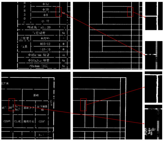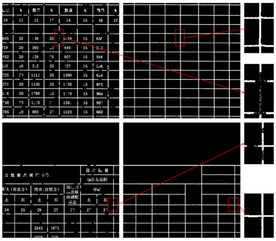 As shown in Figure 9, for the input table drawing image, the red-framed area at the lower left exhibits an issue where characters are adherent to box lines, while the red-framed area at the upper right presents unclear box lines. The table as a whole contains dense discontinuities; however, the network can effectively predict complete box lines despite these challenges.