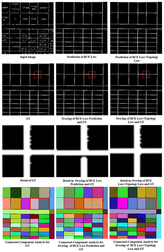 As shown in Table 2, the model trained with only the BCE loss exhibited a connectivity error rate of 1.548%, while the introduction of the topology loss significantly reduced the error rate to 1.070%. This result indicates that the topology loss function substantially enhances the network’s learning capacity regarding the topological structure of table borders, effectively reducing the topology error rate.