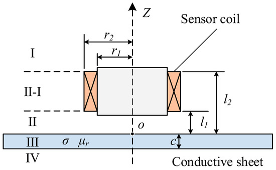 The impedance of a coil placed on a conductive plate can be derived from the classical Dodd–Deeds analytical model. As shown in Figure 1, the solution domain is divided into four subdomains. The magnetic potential in each subdomain is calculated based on boundary continuity conditions, leading to the final analytical expression for the change in impedance of the eddy current sensor [21,30]: