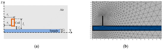 Figure 2a shows that the simulated model consists of an excitation coil and the test sample, with the coil’s geometric parameters detailed in Table 1. The magnetic field interface within the AC/DC module was used to solve Maxwell’s equations in the frequency domain. Magnetic insulation was applied as the boundary condition to eliminate edge effects. The mesh density was set to “Extremely Fine,” as shown in Figure 2b, to ensure the reliability of the simulation results. When the sample thickness was set to 0.5 mm, the finite element mesh comprised 62,920 domain elements and 1667 boundary elements, resulting in 151,367 degrees of freedom, with a minimum element quality of 0.034. As the sample thickness increased to 5 mm, the mesh contained 17,647 domain elements and 704 boundary elements, yielding 41,968 degrees of freedom and a minimum element quality of 0.038. All simulations were conducted on a workstation equipped with an Intel Core i9-14900K 3.20 GHz processor and 128 GB of RAM. The average computation time for each parameter set was approximately 9 min.