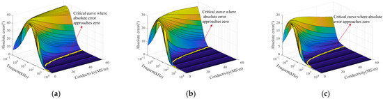 Absolute errors between the simplified model (Equation (18)) and simulation results for different conductivities and frequencies at various sample thicknesses: (a) 0.5 mm; (b) 2.5 mm; (c) 5 mm.