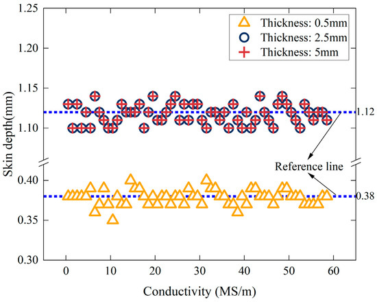 Figure 4 further illustrates that under critical conditions, the skin depth remains constant despite variations in conductivity. However, for the sample with a thickness of 0.5 mm, the skin depth fluctuates between 0.36 mm and 0.4 mm, with an average value of 0.38 mm. For samples with 2.5 mm and 5 mm thicknesses, the skin depth fluctuates between 1.1 and 1.14 mm, with an average value of 1.12 mm. The simulation results are affected by mesh discretization and excitation frequency step size, leading to minor fluctuations in the calculated skin depth.