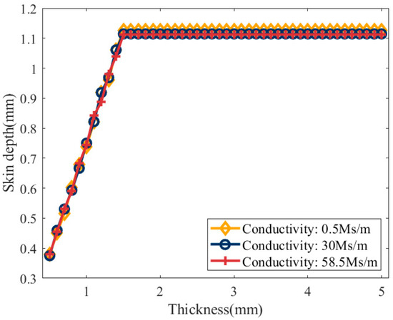 The error distribution shown in Figure 5 shows that the critical excitation frequency depends on both conductivity and sample thickness. As thickness increases, the critical frequency initially rises and then gradually stabilizes. Table 3 indicates that when the thickness exceeds 1.5 mm, the critical frequency becomes independent of thickness across different materials. The skin depth under the critical conditions was calculated to further clarify the relationship between the critical frequency and the sample’s thickness and conductivity. The results are illustrated in Figure 6, with a portion of the calculated results listed in Table 3.