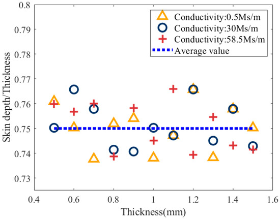 Figure 6 further confirms that the critical skin depth is unaffected by electrical conductivity but depends on sample thickness. Specifically, when the sample thickness c ≥ 1.5 mm, the critical skin depth converges to approximately 1.12 mm and becomes independent of the sample thickness. When the sample thickness c < 1.5 mm, the critical skin depth increases with thickness and exhibits a linear trend. Therefore, for samples with c < 1.5 mm, the ratio of the critical skin depth to the sample thickness was calculated, and the results are shown in Figure 7.