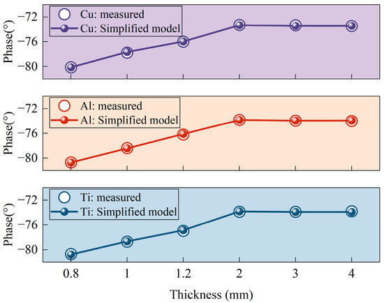 Comparison of measured and calculated impedance phases using the phase-simplified model (Equation (18)) for Ti, Al, and Cu at different sample thicknesses.