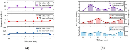Measurement results and error analysis for copper, aluminum, and titanium samples: (a) Comparison between measured and actual conductivity values. (b) Absolute and relative errors of the measured results.