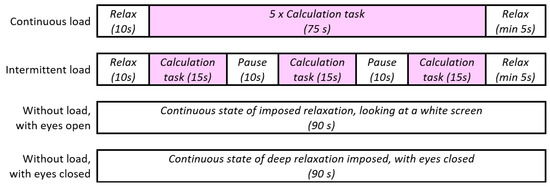 Each task test included a 10 s break at the beginning and a break of at least 5 s at the end. The intermittent task tests were organized with three calculation rounds with 10 s breaks between them, while the continuous task tests had five successive calculation rounds without a break between them, as illustrated in Figure 1.