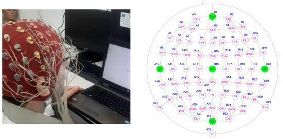 Exploration of the electrical activity of the brain in the experiments was carried out by acquiring EEG signals using the Biosemi Active Two system, configured with 64 channels in monopolar mounting, positioned and labeled according to the international standard “10-20” [Biosemi EEG ECG EMG BSPM NEURO amplifier electrodes]. The equipment used provides a large amount of data from the 64 measurement points that provide good spatial resolution. The EEG signals are sampled at a frequency of 8192 Hz, which allows the acquisition of neuronal impulses on the scalp surface with good temporal resolution. The raw original signals were acquired in the frequency band set to 0.16 Hz to 40 Hz, digitally converted to 24 bits and stored in files in the bdf (Binary Data File) format. An experimental instance and the map of the measurement points are shown in Figure 2.