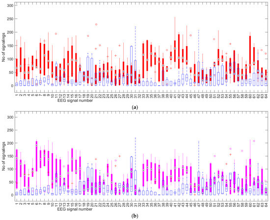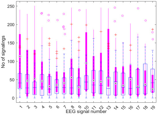 Statistical activity on EEG channels with box plot elements. Empty boxes and blue markers are for data without cognitive load, and filled boxes with red markers belong to data with mental computational load. Magenta circles mark outliers for cognitive load tests. Red + symbols mark outliers for tests without cognitive load. The thin lines in the extension of the boxes denote the range of values.