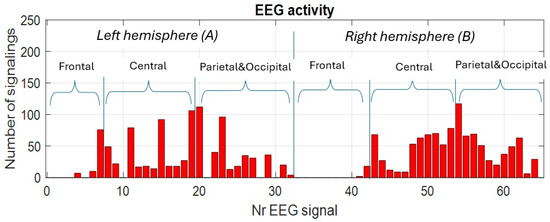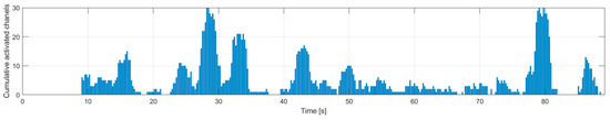 In Figure 5 we provide as an example the detected activity of each channel for the reference no-task test with eyes-open T1. In Figure 6 the evolution of the cumulative activity of the EEG channels during the test is shown, which reflects the fluctuation of the stability of the (relaxation) state imposed during the test. It is observed that most of the EEG channels are active in all areas of the head and, cumulatively, they manifest themselves throughout the test, which proves that the specific relaxation state imposed is not exactly stable in the sense of uniformity. This fact can be attributed to background neural processes, as well as to involuntary mental states. From the point of view of the specific cognitive mental task, these represent responses in the false positive category. The most active and fluctuating signals in the relaxed states were detected in the parietal and occipital areas, in both cerebral hemispheres. The least active channels are detected in the frontal and prefrontal areas and only a few in the central and parietal and occipital regions.