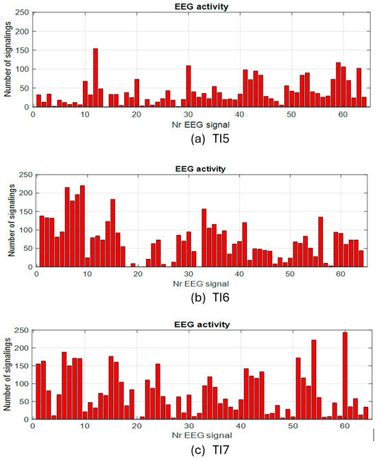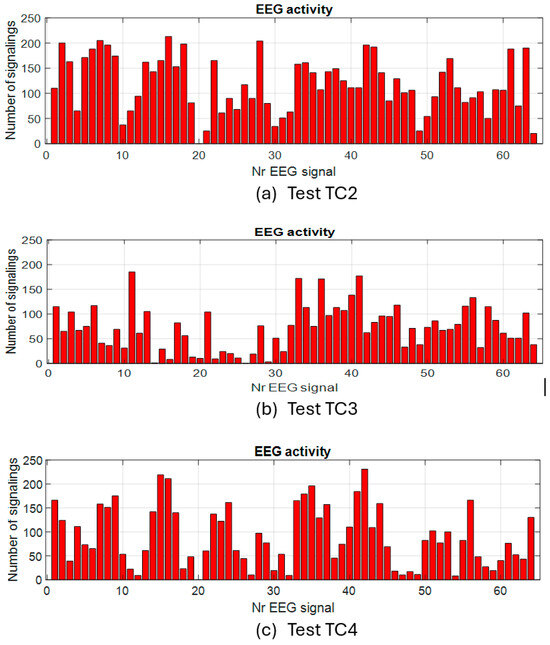 In the case of the tests without load with eyes closed, the activity on the channels has a different appearance than that in the test with eyes open. The study of these experiments will be addressed separately in a future paper. Next, we approach the second step for evaluating the activity on the EEG channels in the presence of the imposed cognitive load. For exemplification, the quantitative graphs with the number of activations on each channel cumulated during the tests with the load are shown in Figure 7 for a few tests with continuous load and in Figure 8 for some tests with an intermittent load.