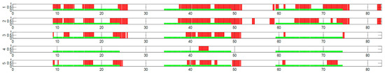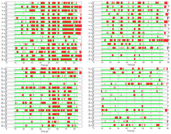 The evaluation of false positive responses is conducted in relation to the temporal application profile of the cognitive task within the tests. Figure 9 shows the activity on channels 1 to 5 in the TI7 test with the intermittent task, where a general synchronization of the detector responses (red bars) with respect to the periods of application of the cognitive task (green lines) is observed. We recall that the statistical test validated channels 1, 2, and 5 at the 95% confidence level.
