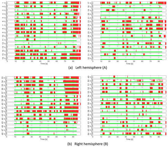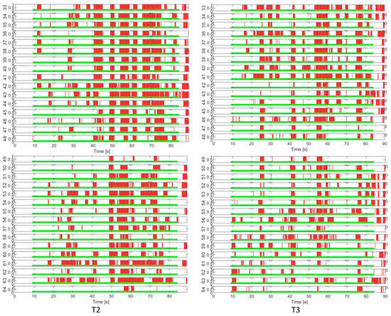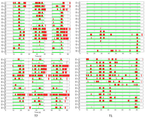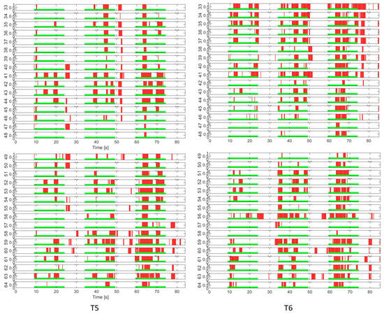 EEG channel activation patterns in T5 and T6 intermittent cognitive load tests. The light green areas indicate the periods of application of the cognitive load. The red areas indicate the detection of EEG activity in response to the load.