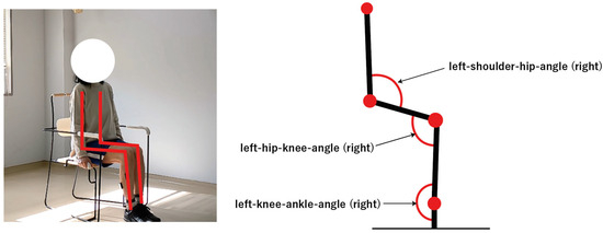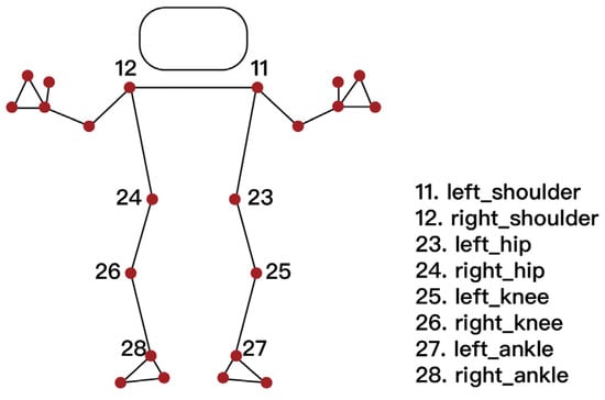 For this study, eight keypoints related to lower-limb kinematics were selected: the left and right shoulders (IDs 11 and 12), hips (23 and 24), knees (25 and 26), and ankles (27 and 28), as shown in Figure 10 [25]. The x-coordinates and y-coordinates of these landmarks were obtained for each video frame. Joint angles were computed using vector-based geometric calculations between relevant segments (e.g., hip–knee–ankle) to quantify motion patterns.