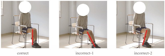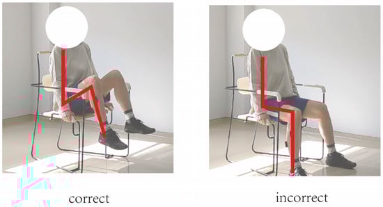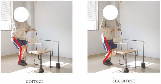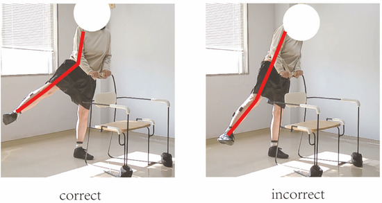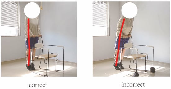 In this study, movement correctness was assessed using six key joint angles, as illustrated in Figure 1. Each of the eight exercises was performed in both correct and incorrect forms. The correct execution was defined in accordance with standard CBE movement guidelines, while the incorrect execution simulated the common deviations observed among elderly participants [19,20,21,22]. Figure 2, Figure 3, Figure 4, Figure 5, Figure 6, Figure 7, Figure 8 and Figure 9 provide representative examples of both execution types, with red markers clearly highlighting the differences in joint positions and movement trajectories.